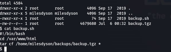 The linPEAS output and manual investigation revealed a backups cronjob that runs as root, saving files to /home/milesdyson/backups using tar