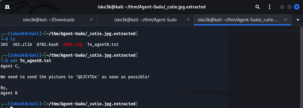 Binwalk finds a Zip archive at offset 34562 containing To_agentR.txt. Let's extract it.