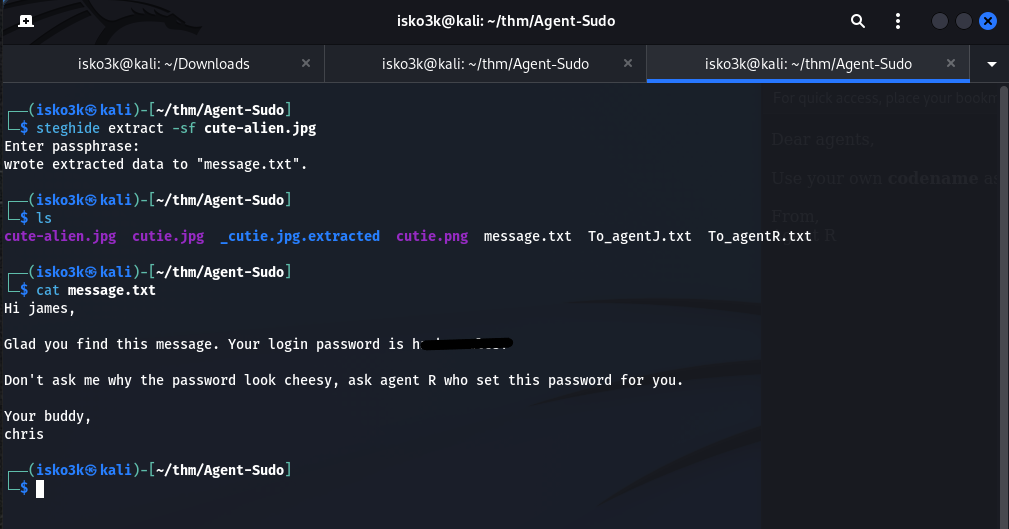 Figure 5.8: Steghide extracts message.txt — james's SSH password revealed
