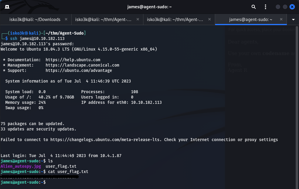 Figure 6.1: SSH access as james — user_flag.txt and Alien_autospy.jpg in the home directory