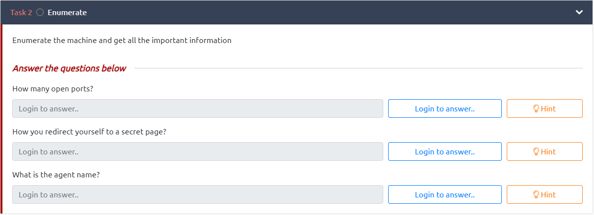 Figure 2.1: Task 2 — How many ports? How do you redirect? What's the agent's name?