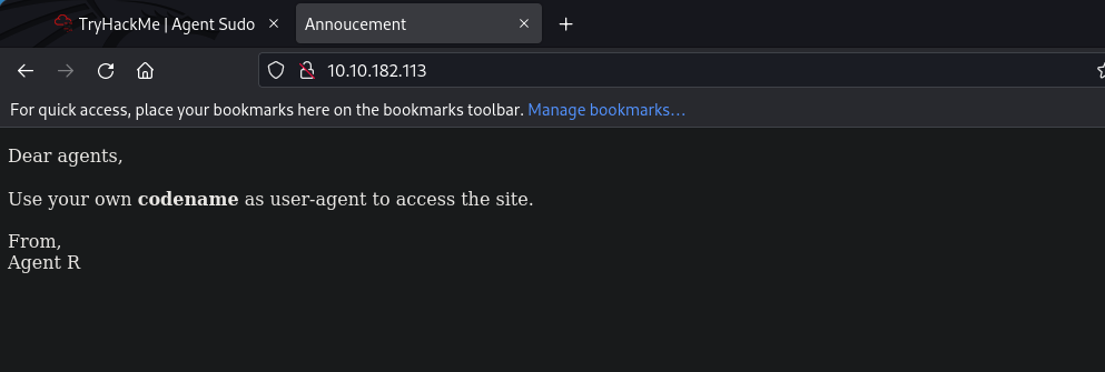 Figure 3.1: "Dear agents, Use your own codename as user-agent to access the site."