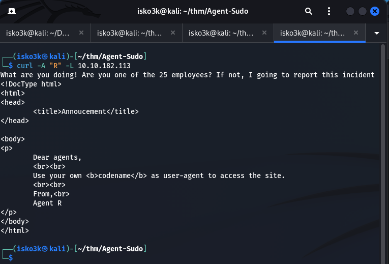 That's our hint. The agents use single-letter codenames as their user-agent strings. Agent R signed the message — so there are at least 25 other agents (A through Z). Let's start testing with curl.
