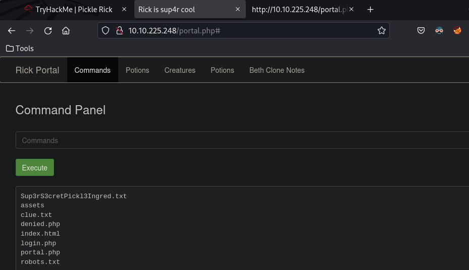 Figure 4.2: The Command Panel showing directory listing with Sup3rS3cretPickl3Ingred.txt