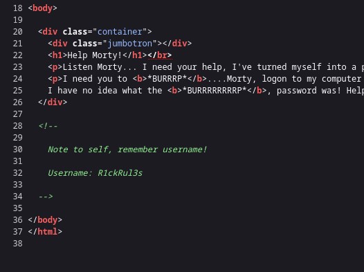 Right off the bat, I check the page source (because that's InfoSec 101). And what do you know — Rick left himself a note: