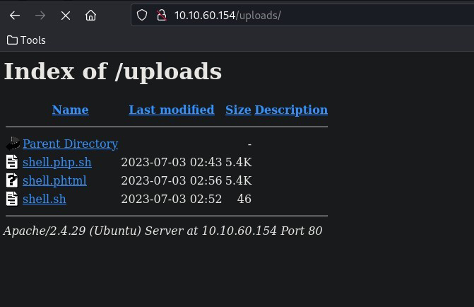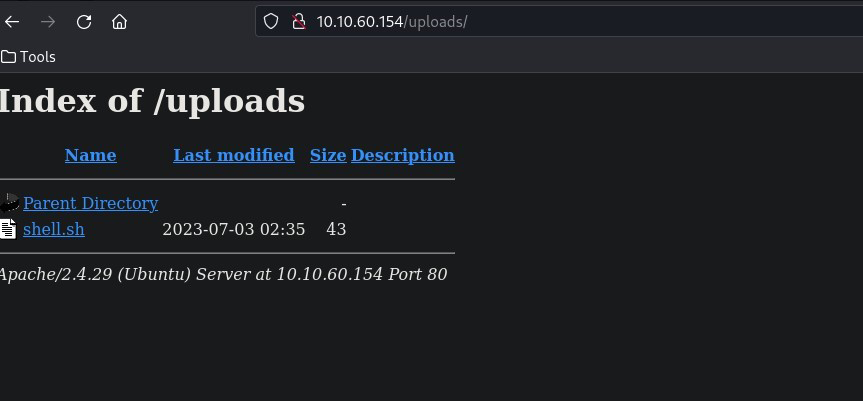 Figure 4.3: The /uploads/ directory listing — shell.sh uploaded but won't execute as PHP