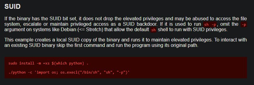 There it is — /usr/bin/python has the SUID bit set. Python with SUID permissions is an instant privilege escalation vector. A quick check on GTFOBins confirms the technique.