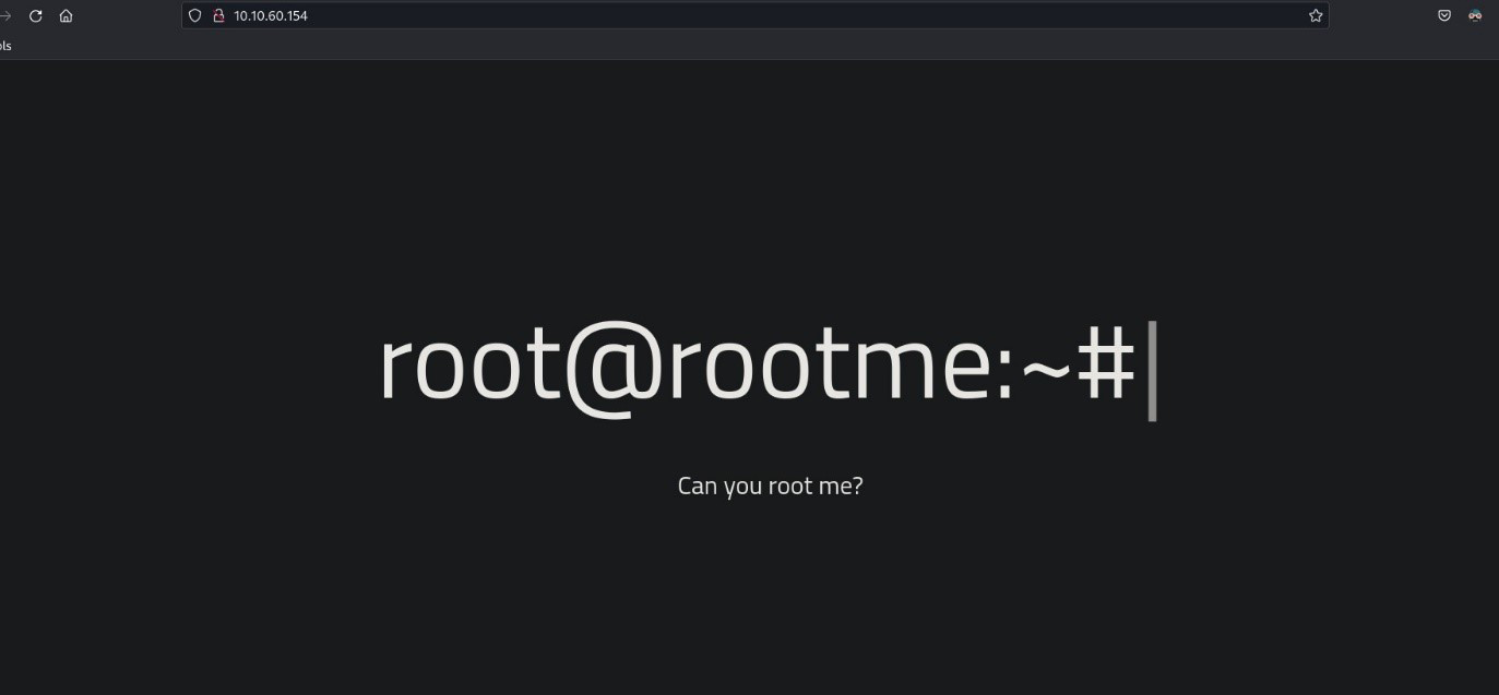 Visiting the site, we're greeted with a dark page showing a terminal prompt — root@rootme:~# — taunting us with the question: "Can you root me?"