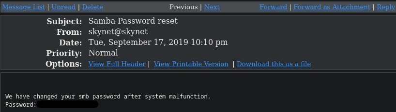 This is where the engagement pivots. Logging into SquirrelMail with Miles Dyson's credentials, we find an email with the subject "Samba Password reset" from skynet@skynet. The message contains the new SMB password in plaintext.