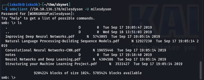 smbclient //10.10.136.178/milesdyson -U milesdyson
