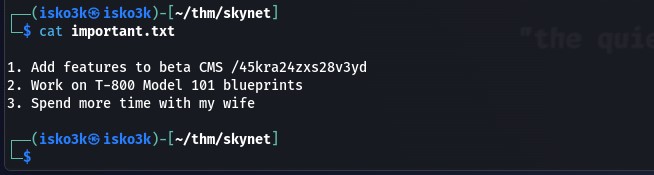 Figure 2.11: important.txt reveals a hidden directory and Miles Dyson's to-do list. The first item points to a beta CMS installation.