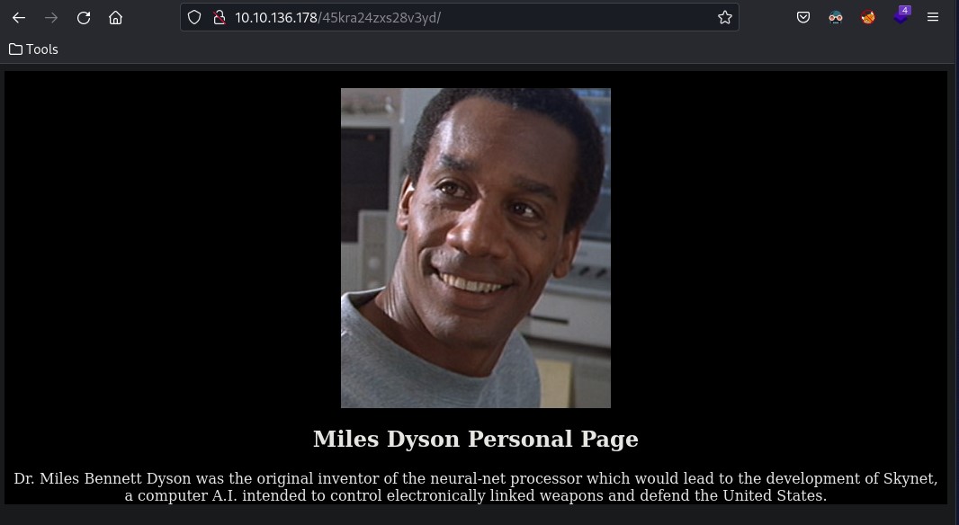 Navigating to /45kra24zxs28v3yd/ reveals a personal page for Dr. Miles Bennett Dyson — the original inventor of the neural-net processor. A nice Terminator reference, but nothing directly exploitable on the surface.