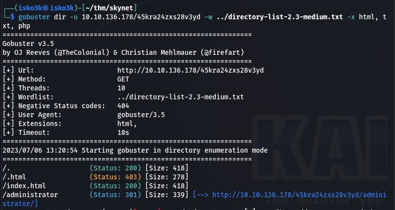 gobuster dir -u 10.10.136.178/45kra24zxs28v3yd -w directory-list-2.3-medium.txt -x html, txt, php