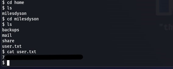 Navigating to /home/milesdyson, we locate and read user.txt.
