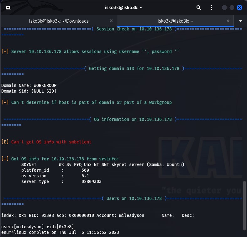 Figure 2.1: enum4linux confirms null session authentication and discovers the milesdyson user profile on the Skynet host.