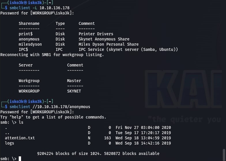 Listing the available shares with smbclient -L reveals several shares, including one labeled "Skynet Anonymous Share" that requires no authentication. Connecting as anonymous drops us into a share containing attention.txt and a logs directory.