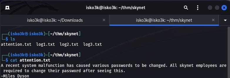We download everything and examine the contents. The attention.txt file is a memo from Miles Dyson himself, instructing all Skynet employees to change their passwords due to a system malfunction. More importantly, log1.txt contains what appears to be a password wordlist. Both log2.txt and log3.txt are empty.