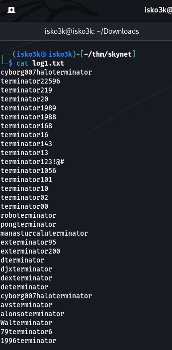 Figure 2.4: log1.txt reveals a wordlist full of Terminator-themed passwords. This is our brute force ammunition.