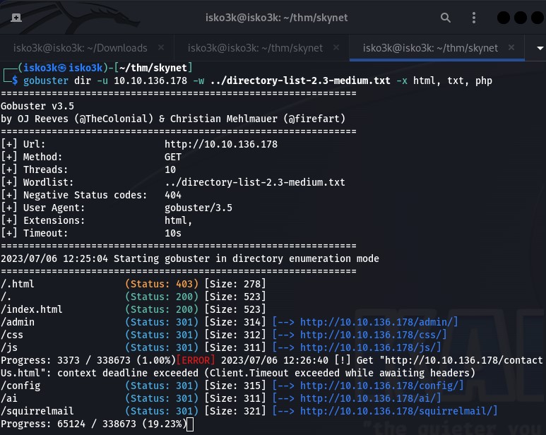 Figure 2.5: GoBuster uncovers a SquirrelMail installation at /squirrelmail — a webmail interface ripe for brute forcing.